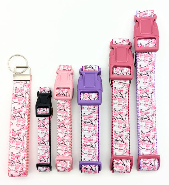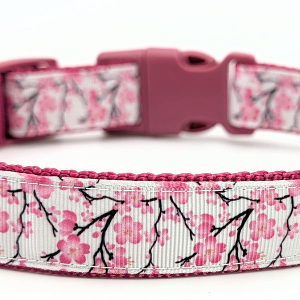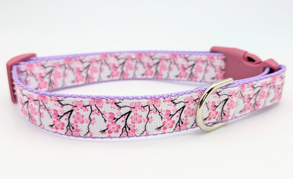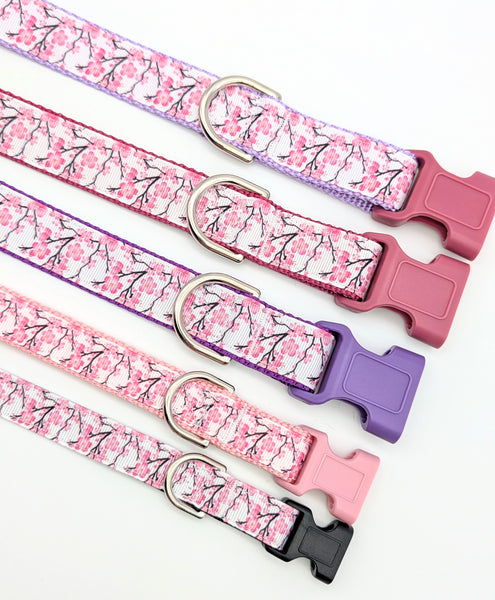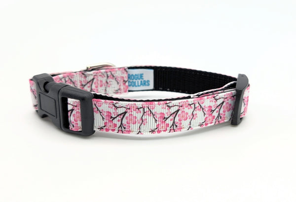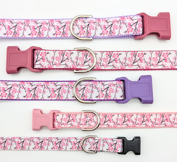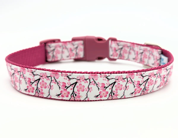 Design Note: The cherry blossom ribbon design remains exactly the same for every collar. You are choosing the custom "frame" (nylon and hardware) to match your dog's unique style!